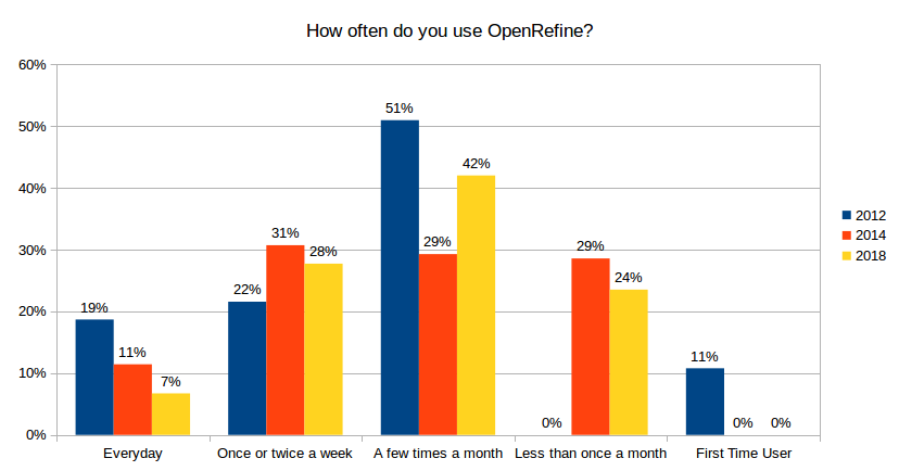 Users with over two years of experience are now representing 50% of the user base (vs. 38% in 2014). If we compare to the previous year, we see mostly the drop in user with less than six months of experience. While we cannot provide a reason for the decline, we can suppose it is due to the survey methodology, the maturity of the self-service data preparation markets with alternative tools available to the users or because fewer people have been introduced to OpenRefine over the last year.