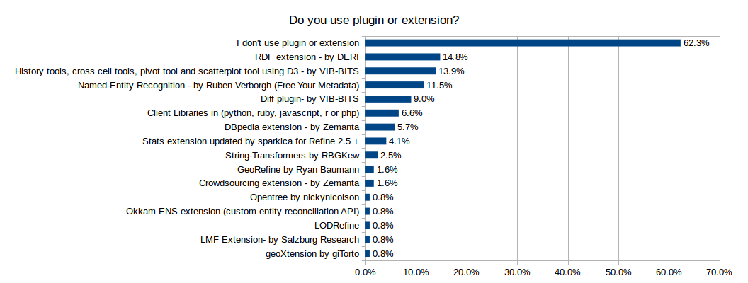 62.3% of the respondents do not use plugins or extension; 22.13% installed only one plugin and 15% of them installed more than one (with one person installing eight plugins!). The RDF extension is the most popular extension with 14.8% of the respondents using it, followed by the VIB BITS and NER plugins.