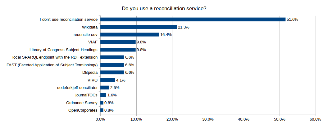 The two top services used are Wikidata and reconcile-csv. 30.33% of the respondent installed only one reconciliation when 18.03% used more than one (with one person using six services!), and 51.6% of them do not use a reconciliation service.