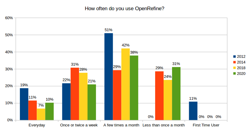 Usage frequency remains globally the same since 2012, with about a third using OpenRefine weekly, a third using it monthly, and a third using it less than once per month. Note that we did not offer the option Less than once a month in the 2012 survey and remove the First time user option after 2012.