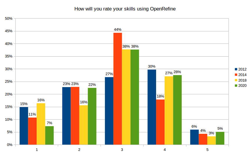 In all our previous surveys, we asked respondents to rate their skills from one to five. One being a novice in Refine and five being a master. The number of novice respondents dropped in 2020 from 16% to 7%. The skills level is related to the frequency of usage and not to the years of experience. No matter how long you have been using GREL, you got to practice it every day to improve!