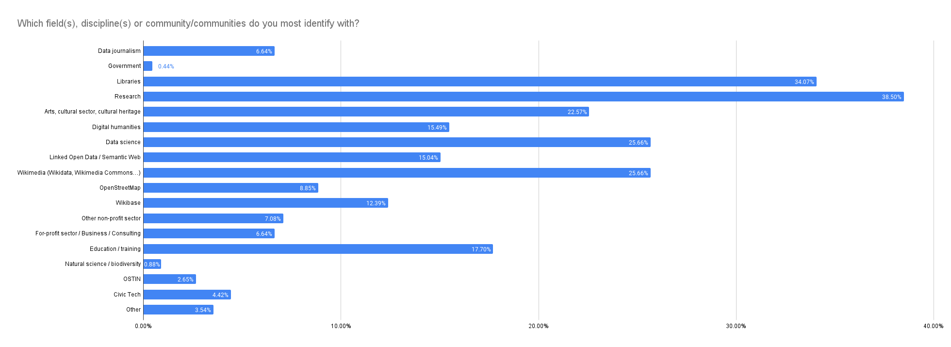 Overall, our largest communities remain stable, with Researcher (38.50%) becoming the largest, followed by Librarian (34.01%), Data Science (25.66%), Wikimedian (25.66%), and GLAM (22.57%) close behind.