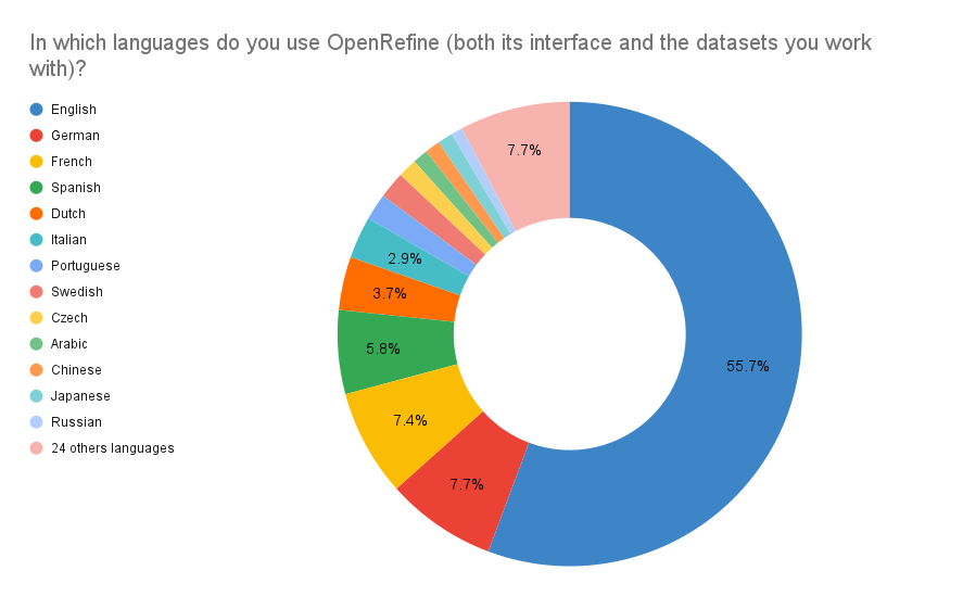 The question "In which languages do you use OpenRefine (both its interface and the datasets you work with)?" reveals the diversity of our community, with 37 languages reported. English is less dominant than it was two years ago, dropping from 64.1% to 55.7% this year. German, French, and Spanish remain the top three other languages, followed by a long tail of 33 other languages.