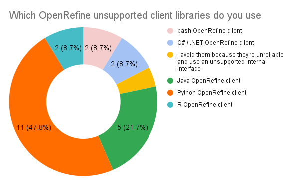 Only 12.39% of the respondents use a third-party library to automate OpenRefine tasks. The Python client is the most popular one, with 47% usage.